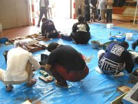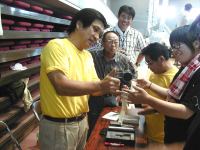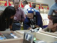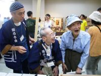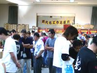 三条削ろう会が開催された9/30・10/1は2日間ともこの季節にしては珍しいくらいの 強い日差しがまぶしい晴天に恵まれました。(多分みなさんの普段の行いが・・・) 翌日が朝から雨降りだったことを思うととてもラッキーでした。 当社が全国削ろう会へ出展するのは第8回与板大会以来でその頃とは 比べられないほどの規模になっているので勝手がわからず心配でした。 9/30当日朝から搬入開始し、まだ並べ終わらないうちに前日から泊まっていた お客様が次々と来場されその状態が終日続きました。 販売会場にいるとわからなかったのですが、駐車場は常に満車状態で かなり待たされたようです。 削り会場につながる外のスペースにはいろんな食の出店とイベントが。 お好み焼き、おやき、ラーメン、新潟カツ丼、串焼きなどに混じり、 なぜか宇都宮餃子まで。(おみやげに買って帰り喜ばれました。しかしなぜに宇都宮?) イベントとしては、与板の「村のかじや」、カネジュンさんの「鋸の銑かけ」、丸太はつり、 和釘造りなどなど。 別棟では本などでしか拝見したことがない千代鶴是秀氏の貴重な切り出しなどが ガードマンに警備されて特別展示されていましたが、撮影禁止でしたので 目に焼き付けてきました。 削り会場には削り台が75台に各2本で150本の削り材がセットされて壮観でしたが、 初日はまだ人もまばらで本番の明日を待っていました。 無事初日の販売を終了した後、夜の懇親会会場へ。 今回は参加者全員におみやげ(鉋台、おろし金、湯飲み茶碗のいずれか)が 配られたあと広い会場が約500人の参加者でぎっしり。 大会会長の馬場正行氏の「ありがとう!」の一言の挨拶に始まり、 実行委員長の沖野幸平氏、泉田新潟県知事、 高橋三条市長などの挨拶がありました。 続いて、削ろう会事務局長の杉村幸次郎氏が壇上に「5人衆」を集め、 尾上先生から今後の「削ろう会」の方針が報告され、今後は全国削ろう会会長として 杉村さんに引き続きこの会をリードしていただくことになりました。 その後、削ろう会応援団長の永六輔氏の発声で鏡開きから宴会スタート! 立食形式だったので食事がセットされたテーブルはあっという間に人だかり。 お腹が一息つくと、飲んで語って笑って楽しい時間を過ごせました。 2日目は初日以上に朝一番からお客さんで大混雑。 あっという間に一日が過ぎて、気がつくともう3時、削り会場へ表彰式を見に行く。 写真を撮ろうと前の方に陣取ると、その前に地元テレビ局のBSNと 地元新聞社の新潟日報のスタッフもいっしょに取材。 今回特別に設定された各賞は 県知事賞 沖野昌男氏(新潟県燕市) 大鉋8ミクロン 三条市長賞 工藤一男氏(大阪府) 寸八鉋4.5ミクロン 削ろう会賞 豊田勝彦氏(神奈川県) 〃 6.5ミクロン 三条大会賞 初野増夫氏(埼玉県) 〃 7ミクロン 以上の皆さまおめでとうございました。 刃物の産地の三条での開催でしたが、あとでいろいろお聞きするところによると かなり好評だったようで喜んでおります。 次回の開催日時、場所はまだ未定ですが、またお会いしたいと思います。 ありがとうございました。 |