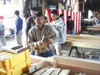 | 秋晴れが続く中、夜半に雨が降り心配していたのですが、曇り空のもと平成15年10月12日(日)第2回目の 与板削ろう大会が開催されました。今回は樺村組さんのご協力で製材所を貸していただき、広い場所での 削りコンテスト・展示会場となりました。 今回、当社は展示即売会に出店させていただいたので、前日のテント張り準備に続き当日は8時から コーナー作りに追われていたのですが、9時からの開会前にもかかわらず、人・人・人で熱気ムンムンでした。 県外からおいでで、夜中の2時頃から駐車場で泊まり込みの方もあったとか・・・ 開会式に続き早速腕自慢の削り大会が始まりました。皆さん真剣な表情で削っていらっしゃる中、会場では 半纏姿でにこにこと元気な碓氷さんの姿もお見受け致しました。小雨がぱらつきましたが、外のテントでは 古式鍛錬の儀式が始まりました。従来、「ふいご祭」の時に金山神社の前で年1回行われる行事なのですが、 最近はいろんな場面でよく目にする機会があります。司会は横坂さんがやっていらっしゃいました。 横坂さんも腰を痛められ心配していたのですが、お元気そうな様子に一安心。でも鉋作りはしばらく無理との事。 早く治ってまた良い鉋を作ってくださいね! 展示会場も入れ替わり立ち替わりで大盛況でした。当社HPをご覧のお客様も多数ご来店で、社長が居りましたら 大感激だった事と思います。お立ち寄りの奥様が削り華をたくさん手にしていらっしゃったのでお聞きしたら、紙に 貼ってのれんを作られるとの事。色々な用途にビックリ! 昨年、削り会場だった「よいた街・愛ステーション」では、前場大工道具資料館として資料展示が行われていました。 昔、実際に使われていたノミや鋸・そして年季の入った型変わりの墨壷は圧巻でした。 それぞれお昼をとる際、街中のあるラーメン屋さんが大はやりだった様子。 「ここの激辛ラーメンを食べて来なきゃダメだと言われた」という方もいらっしゃいました。 午前の小雨も一時だけで、午後からは暑すぎず寒すぎずのよい天候に恵まれ、和やかに会が進みました。 スタッフに伺ったところ、県内外からたくさんのご来場で300〜400人と昨年を大幅に上回る大盛況でした。 3時を過ぎると会も押し迫り、いよいよ成績発表。昨年に引き続き上位入賞者から順に豪華景品を選ぶ事が できます。 第1位は見事4〜5ミクロンを出した原 利夫さん。地元でもありすでに碓氷さんの鉋を持っていると遠慮され あえて碓氷さんの鉋ではない鉋を選ばれました。第2位は6ミクロンを出した岐阜から初参加の大野さん、 当然碓氷さんの「晩悠」を手にされました。第3位は6〜7ミクロンで浜田さん。第4位は7ミクロンで星野さん。 第5位は8ミクロンで7人が並ぶ大接戦でした。 入賞者一同で写真を撮りました。 4時に始まった後片付けもあっという間に終わり、あんなにたくさんの人もどこに消えたのかと思うほどスッと はけてしまいました。 ご準備くださった主催・共催の方々ありがとうございました。 また、展示会に来てくださった方々に不手際がございましたらお詫び申し上げます。 皆さん一度参加されてみてはいかがですか? 来年もお待ちしております。 |