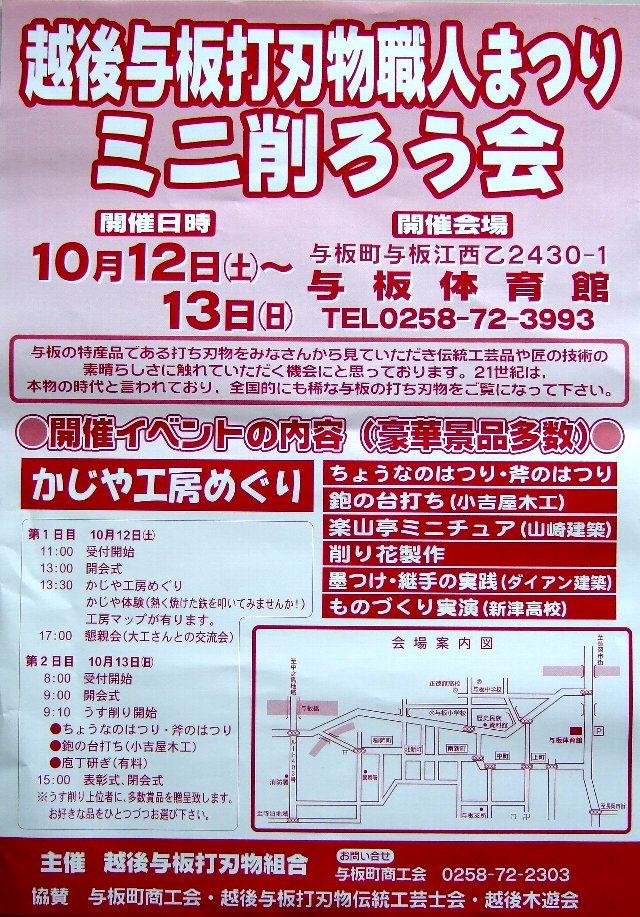 | 「第三回 越後与板打刃物職人まつり ミニ削ろう会」の様子は ブログでご覧ください。 |