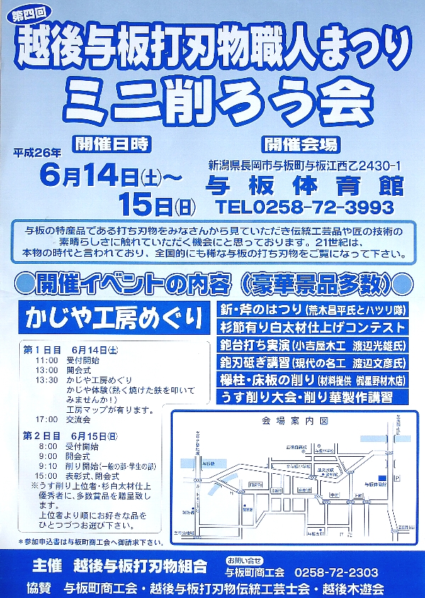 | 「第四回 越後与板打刃物職人まつり ミニ削ろう会」の様子は ブログでご覧ください。 |