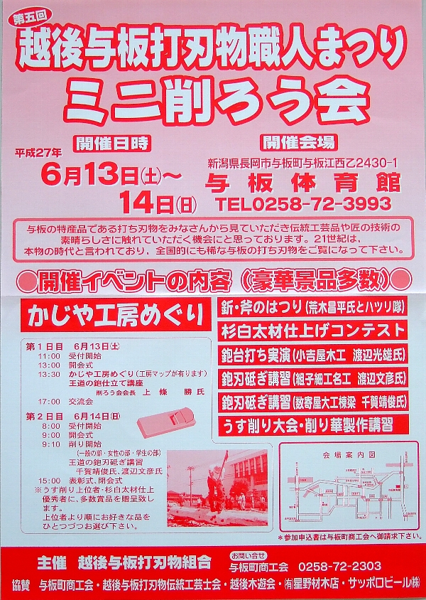 | 開催日 平成27年6月13日(土)・14日(日) 会 場 長岡市与板体育館 (新潟県長岡市与板町与板江西乙2430-1)TEL:0258-72-3993 主 催 越後与板打刃物組合 協 催 与板町商工会・越後与板打刃物伝統工芸士会・越後木遊会・(有)星野材木店・ サッポロビール(株) 参加費 1,000円/一人 (皆様からの参加費だけで、開催・運営致しております。) 持ち物 うす削り材、道具等は各自ご持参ください。 その他各地自慢の名産品・おつまみ・地酒等の差し入れ、その他必要と思われる物 交流会 6月13日(土) 17時〜20時 与板町体育館3F和室にて行います。 交流会費 3,500円 【 参加申込 】 ※ 電話かFAXで事務局へ申込書をご請求ください。 申込締切日 5月30日(土) 【 期日厳守 】 申込先 越後与板打刃物職人祭&ミニ削ろう会事務局 (与板町商工会内) 与板町商工会 〒940-2402 新潟県長岡市与板町与板甲134-2 TEL:0258-72-2303 FAX:0258-72-3328 宿 泊 ご希望があれば直接申し込みください。 越乃湯(こしのゆ)温泉 長岡市与板町馬越1082-1 TEL:0258-72-4385(送迎バス有り) 寺宝(じほう)温泉湯治館 長岡市寺宝町82番地 TEL:0258-29-4126 越後交通(株)観光営業部 長岡観光センター TEL:0258-39-1541 |